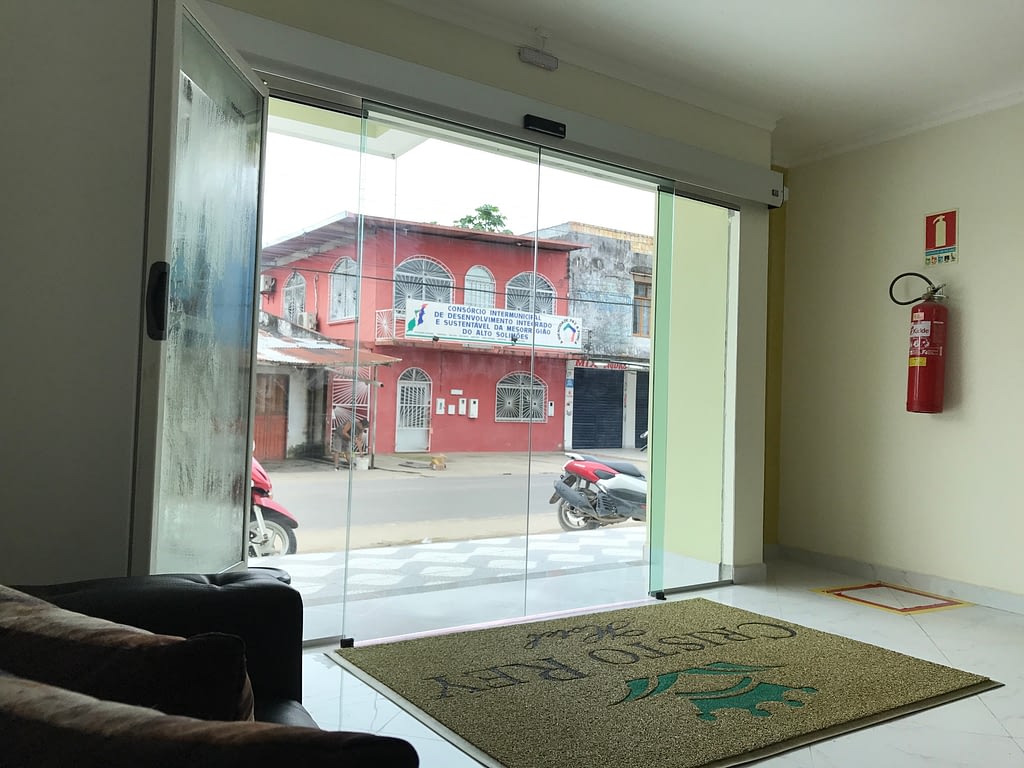 Equipo Dítec Rex en la entrada principal de un Hotel en el Amzonas.