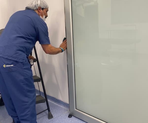 Vestido con indumentaria estéril, refleja el alto estándar de higiene y precisión que OSSAC aporta a cada entorno médico, Confía en la destreza y el cuidado de OSSAC para el mantenimiento de tus puertas herméticas.